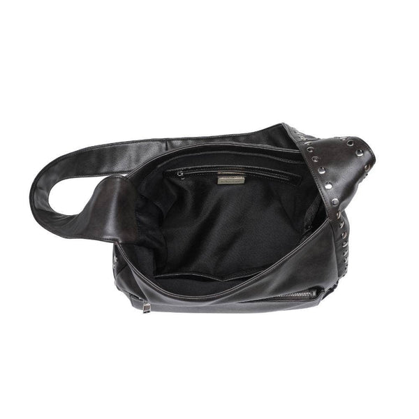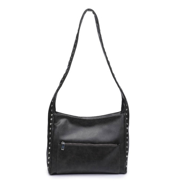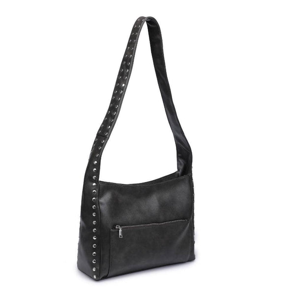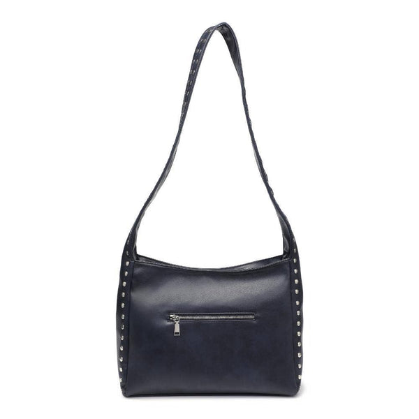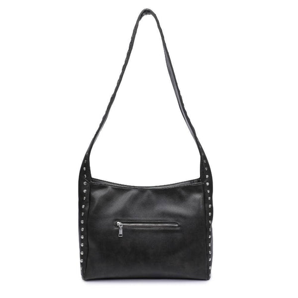 Elevate your everyday ensemble with this chic crossbody crafted from smooth vegan leather. Adorned with stud embellishments, it features convenient front and back zip pockets for easy access to your essentials. Inside, the fabric-lined interior boasts a zip pocket and two slip pockets, ensuring your belongings are organized with style.