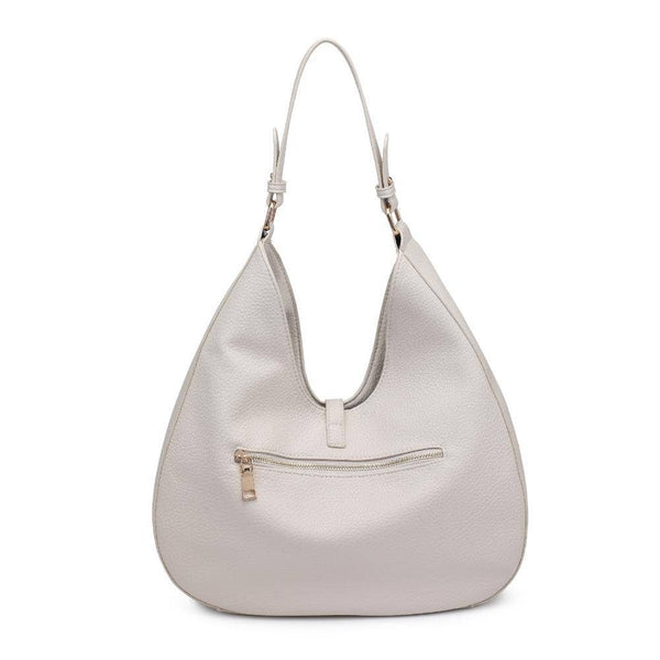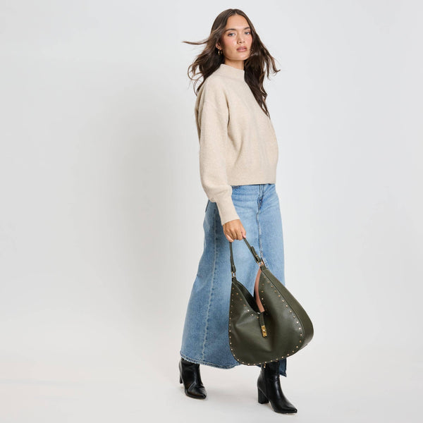 Introducing a hobo bag that effortlessly blends edge with elegance, crafted from pebbled vegan leather. The exterior boasts stud embellishments and gold hardware, while the turn lock loop closure adds a touch of sophistication. Inside, a printed fabric lining, one zip pocket, and two slip pockets ensure your essentials are stylishly organized.