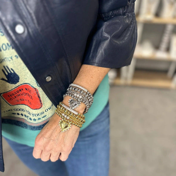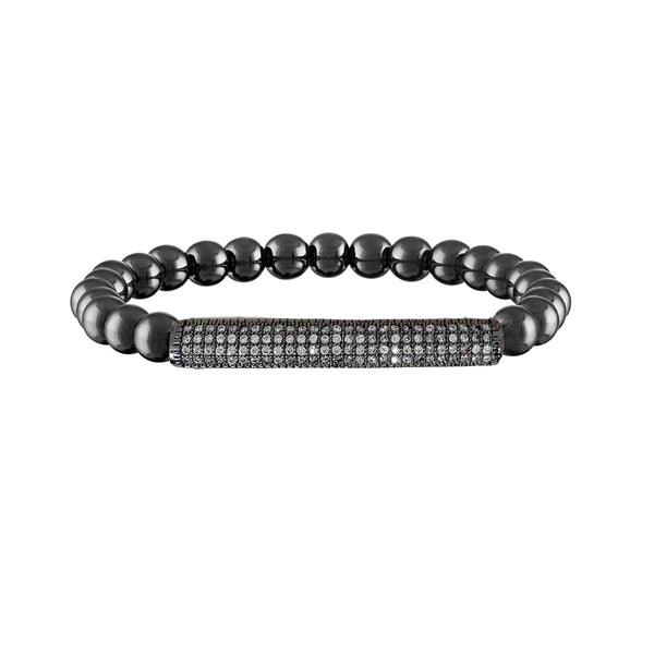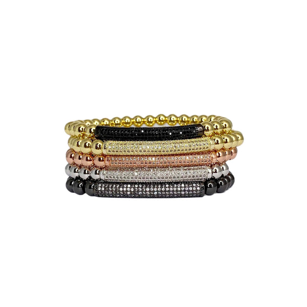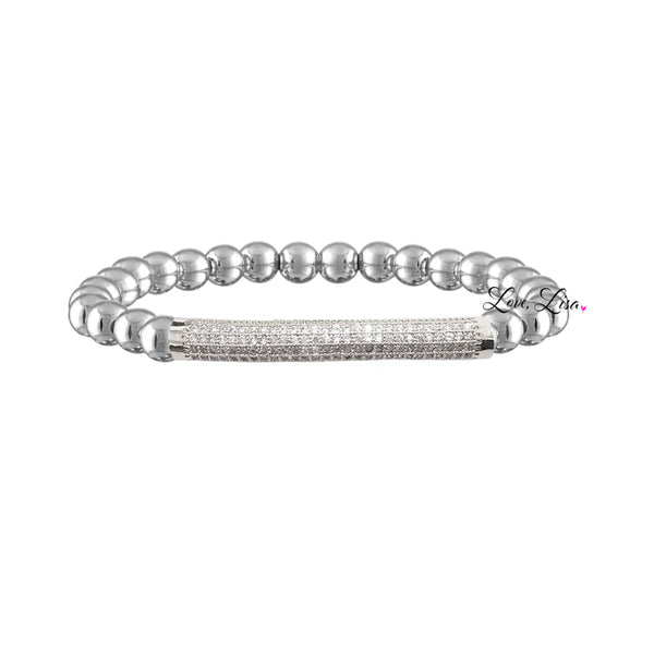 The bar bracelet is such a great basic to own! It's handmade with beautiful 6mm beads. This elegant bracelet features micro pave brass beads, set in a bar shape for maximum sparkle and shine. The comfortable wear and durable design ensures a long-lasting and eye-catching accessory to wear time and time again, perfect for adding a classic touch of glamour to any look. The bracelet is made with elastic and measures 6.85".