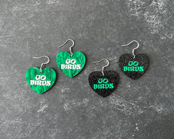 These playful football season mini dangles are cut from black glitter or kelly green pearl acrylic and feature 'Go Birds' in the classic retro Eagles font. Fun, sparkly, and most importantly, small and lightweight—these earrings are perfect for those who want to make a statement on game day without going too big!