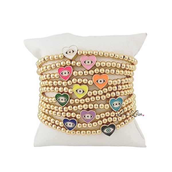 The Sandi Enamel Heart Evil Eye Beaded Bracelet is a beautiful combination of the classic beauty of a heart and the protective power of an evil eye. It is hand-made with 4mm gold brass beads and has a comfortable elastic fit, which makes it both stylish and functional. Add a touch of style to your look, and also benefit from the added protection and peace of mind that it provides. 4mm gold brass beads and a comfortable elastic fit, this bracelet is both stylish and fun. Measures 6.85"