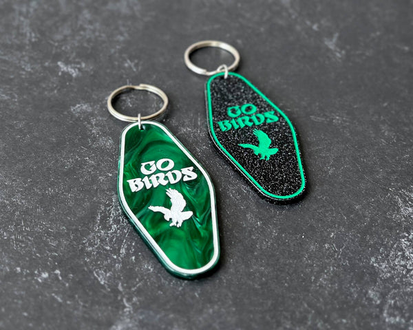 Looking for the perfect keychain to show off your Eagles pride during football season—or all year long? The 'Go Birds' keychain is available in two styles: green pearl acrylic with white hand-painted details, or black glitter acrylic with green hand-painted accents. Lightweight and durable, these keychains are a must-have for any Eagles fan!