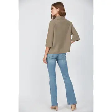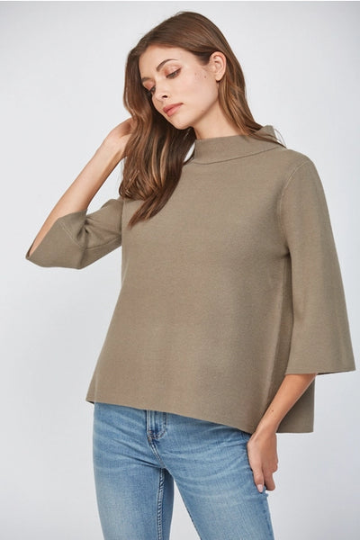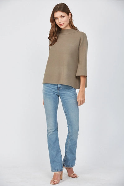 Washed Olive mock neck pull over sweater with bell sleeve.