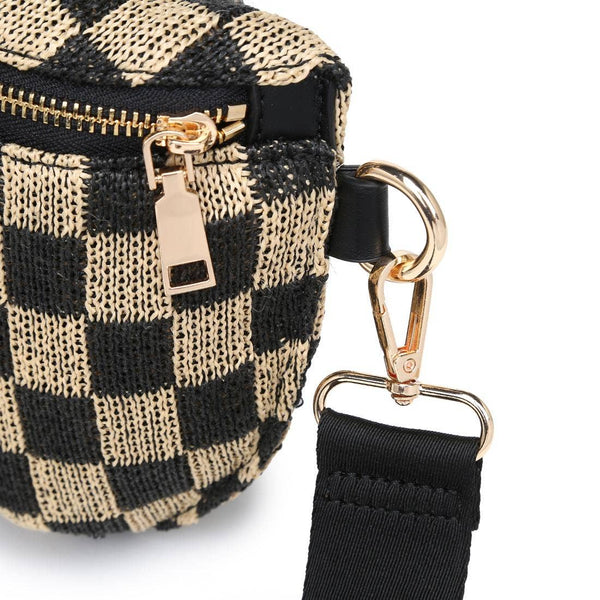 Knitted checkerboard belt bag with polished hardware. Spacious main zipper compartment, exterior zip pocket, adjustable wide strap for waist or crossbody wear. Fashion-forward yet practical, this large belt bag organizes essentials hands-free, perfect for city errands, travel, festivals.