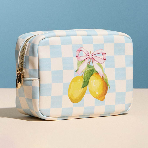 Playful lemon print cosmetic pouch designed for everyday organization of makeup, toiletries, and small accessories. Features a structured shape, secure zipper closure, and spacious interior ideal for travel, handbags, or vanity storage. A charming option for gifting, vacations, or keeping essentials neatly organized on the go or at home.