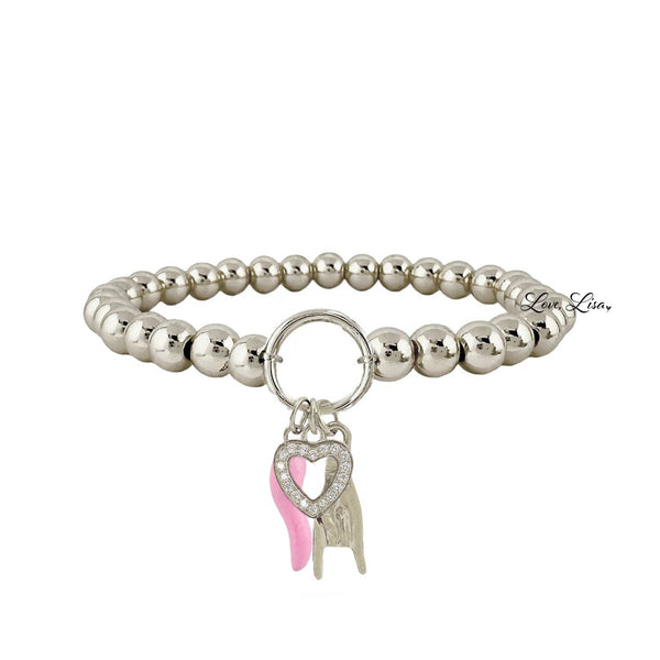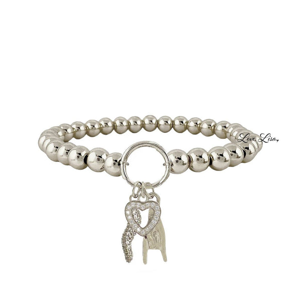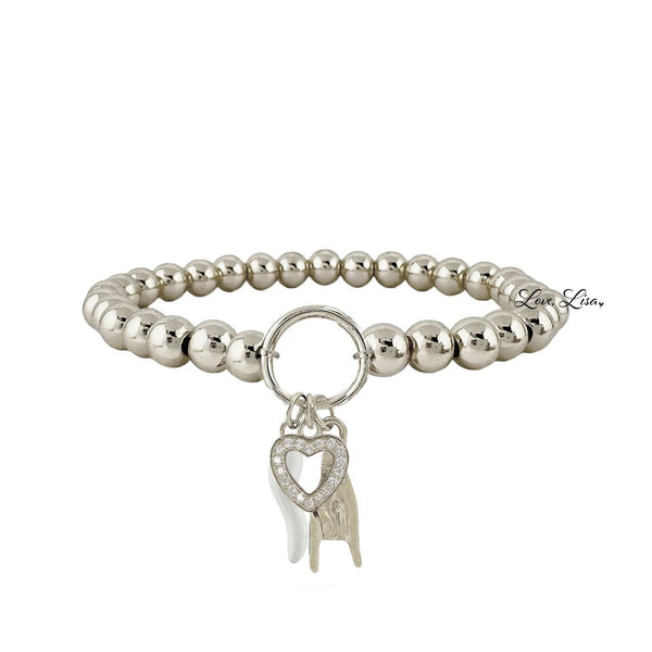Stretch bracelet featuring polished metal beads with three symbolic charms including an Italian horn a mano cornuto hand and a pavé open heart. Designed for everyday wear and easy layering. Finished with durable stretch cord. Measures approximately 6.85 inches. Available in gold or silver with multiple horn color options..