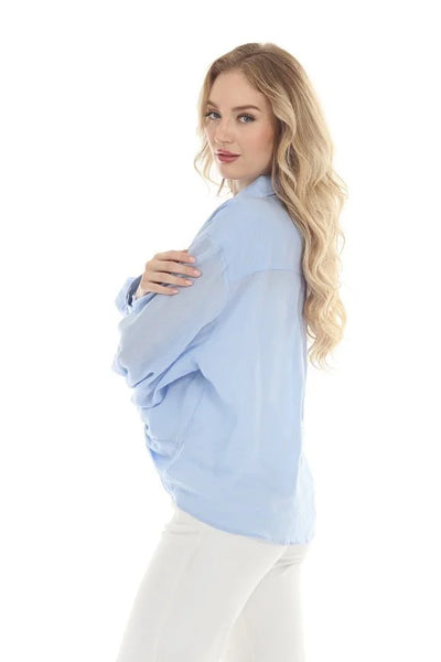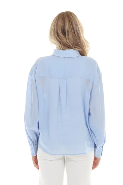 This lightweight button-down shirt features a front twist detail that adds a modern touch to its classic silhouette. With long sleeves and a relaxed fit, it’s perfect for effortless styling from day to night.
